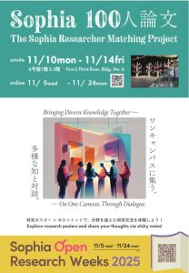 2025年11月、Sophia Open Research Weeks企画として、「Sophia100人論文」(日本語・英語)を実施しました。本イベントは、上智大学の教員・研究者・大学院生が A3一枚のポスターに自分の研究やアイデアを凝縮して掲示することによって、異分野の知と出会う場を創出します。第2回となる今回は、オンラインとオンサイトのハイブリッド形式で実施しました。